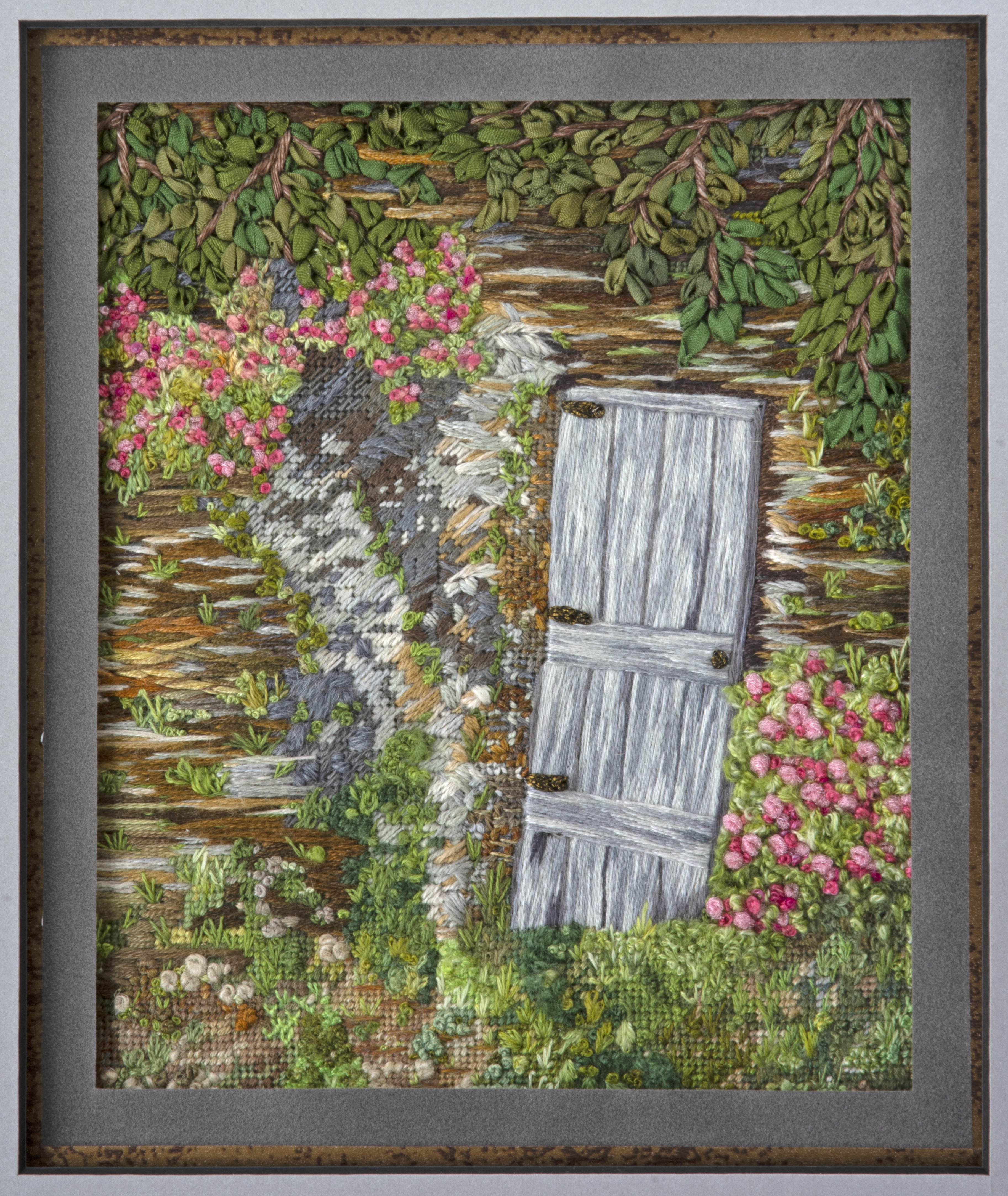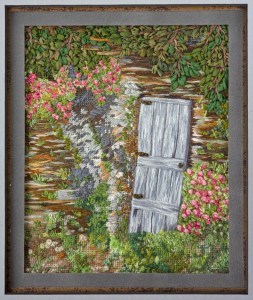 The pandemic forced me to focus on stash items so my little door came out again and I worked on it throughout 2020, again putting in stitches and taking them out. The most difficult part was trying to get the depth perspective correct between the rock wall on the left and the recessed doorway.