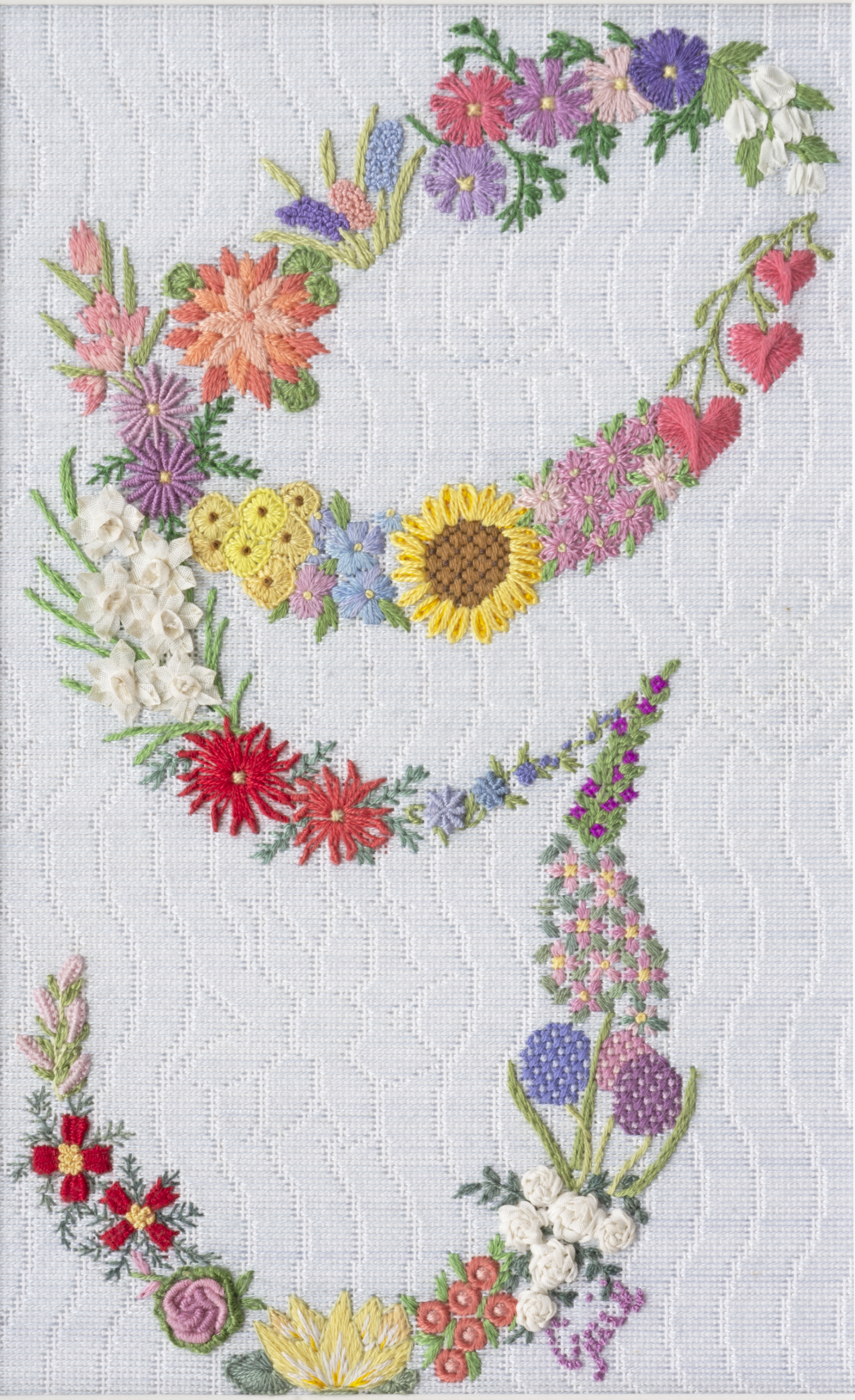 This piece was stitched totally on a whim. I have done a bit of calligraphy in my life, so have a fondness for letters and “fonts.” I also am well known for stitching flowers—lots of flowers. So why not a few more? I had been impressed by a few designs by other designers that involved garlands of flowers, so I decided to combine the two concepts and stitch a monogram made of flowers. What better than my first initial?