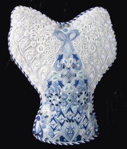 I selected this class taken at the MAR EGA Regional Seminar as I enjoy doing Jean Hilton type stitches and thought this design would make a nice holiday decoration. I also liked it since it was not a traditional Christmas color. The threads include Soie Perlee, Petite Silk Lamé Braid, Elegance silks, Petite Very Velvet, Accentuate, Kreinik, and Treasure Braid metallics. There are various types of beads plus some crystals. The stitching involved a lot of counting but was well worth it. The beads and crystals add so much sparkle to the design. (Designer: Kurdy Biggs)
