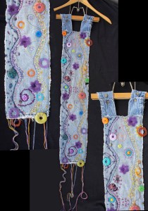 This piece began as experimental embroidery on the pant leg of my son’s outgrown blue jeans. From my sizeable stash I selected various colorful threads and beads that played well together. I was especially careful to include many purples, Tim’s favorite color. After starting with purples, I thought I might try working with complementary colors, so I used yellows. Then I kept stitching, adding more threads, more beads, more color. With time the piece took on a life of its own. What started as a materials-focused exercise became so much more.
