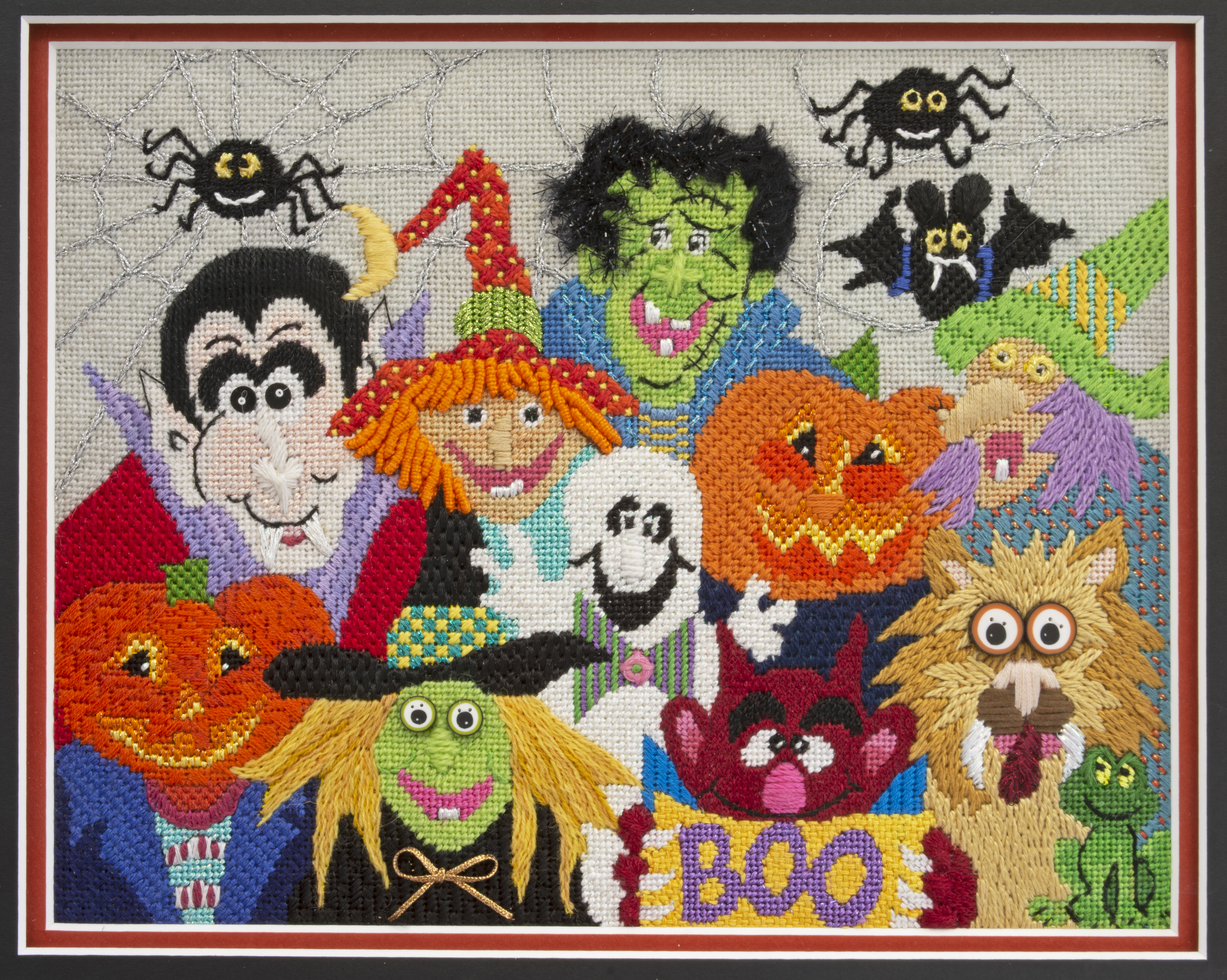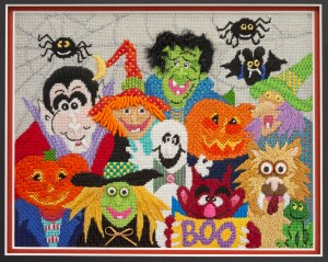 I used threads from my stash for this fun canvas. Stitches were selected from my memory or previously learned from other classes. The background (sky) needed to be plain; basketweave, as the characters were very bright and busy. Designer: Renaissance Designs