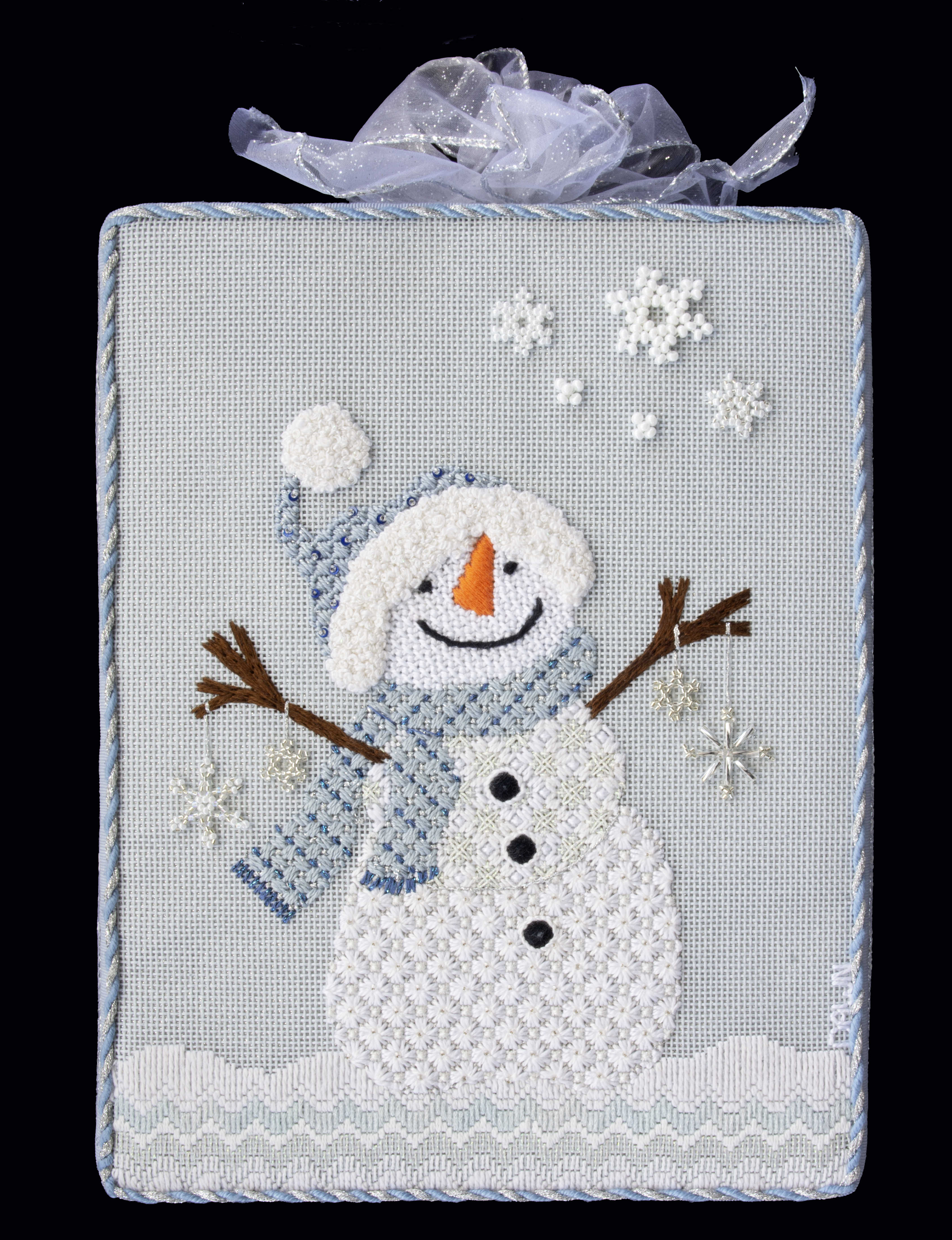 I wanted to create a snowman containing no Christmas colors — something I could keep out after all the decorations were taken down. So, light blue was selected. I spent some time searching for stitches reminding me of snow or snowflakes. I created beaded snowflakes to hang from the arms; I watched more than a few videos to figure those out. Six of the snowflakes are created off the canvas, then attached. The others are stitched directly onto the canvas.