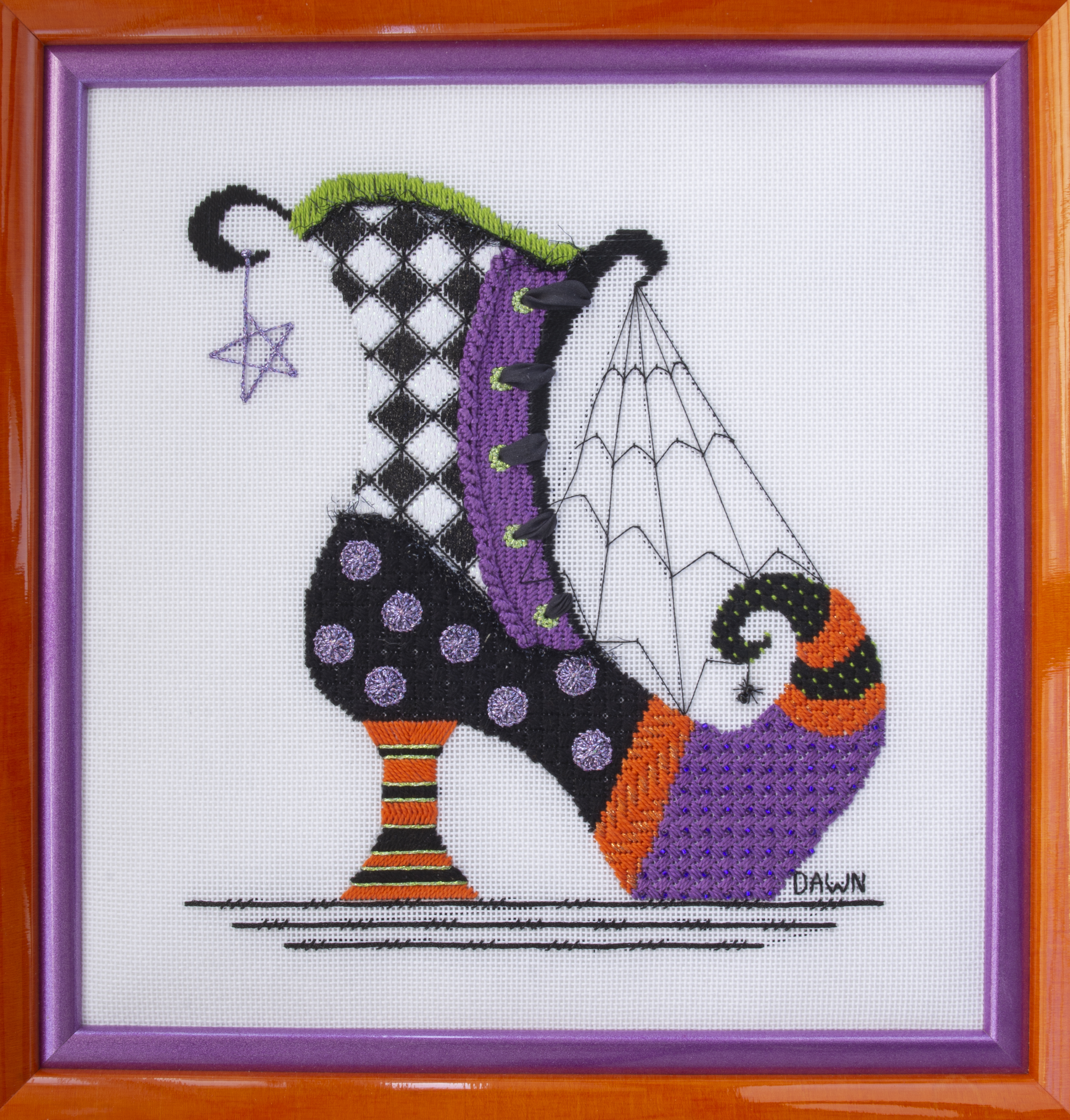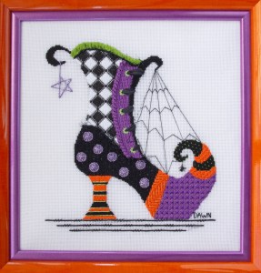 “The Other Shoe” is a companion piece to “No Spells Tonight”, which is another of my Halloween shoe designs. I wanted to create another shoe pointing in the opposite direction, taller and including an argyle pattern, a web and beaded spider. In addition, I wanted to find a way to include one of my favorite stitches, Branscombe Edge, and use silk ribbon as laces coming in/out of eyelets.