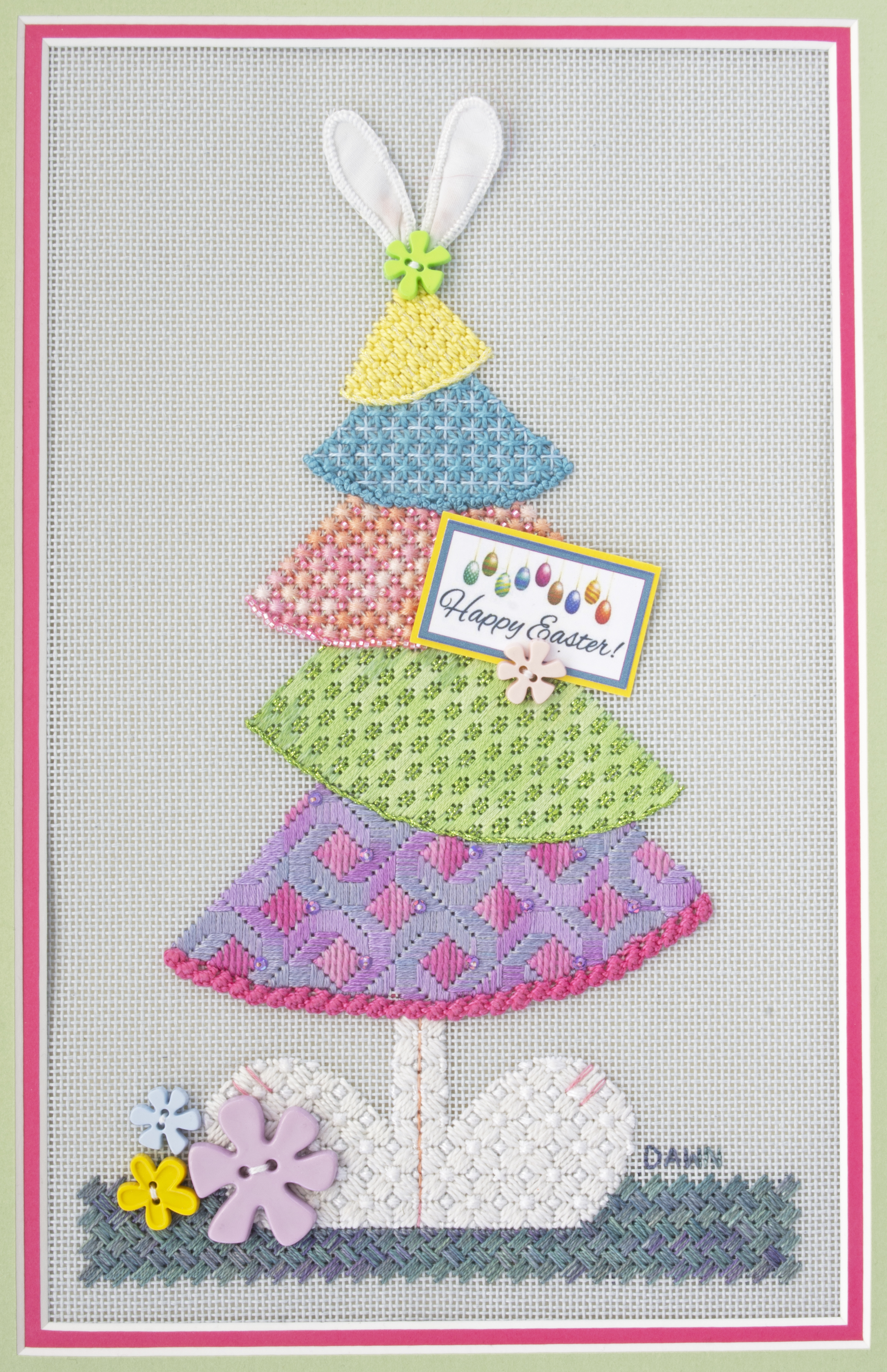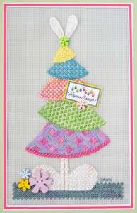 Simply Spring is another one of my whimsical tree designs. When I thought of Easter and my trees, I saw a bunny. I’d been looking for a stitched piece to hang at that time of year and have it not be cheesy. So, I took the base pattern of my trees and made a few changes: adding bunny feet as the base and floppy bunny ears, which could also bend, as the topper. The ears are made with buttonhole stitches around wire sitting on white cotton fabric. And, finally, picking those spring colors and fun buttons.