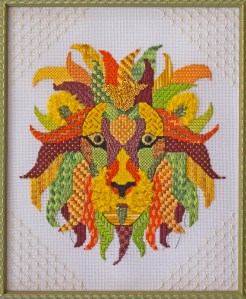 Larry is a ferocious Patchwork Lion that explores many different stitches to create a happy addition to your needlework decorations. He is the third in a series of Patchwork animals; the first was Elliot the Patchwork Elephant followed by Gertrude the Patchwork Giraffe. The autumnal feel of the colors makes stitching on this canvas a dream. Driving through Colorado on a beautiful fall day inspired the color choices for this design. The optional addition of a fun gold beaded crown and whiskers makes Larry the definite “King of the Jungle”. Several Rainbow Gallery metallics, Vineyard Silk, Treenways Silk Eyelash, and Planet Earth Silks, along with beads and sequins, are used to create this charismatic design. The stitches include old favorites, as well as a few surprises. The background is a white-on-white diagonal pattern that emphasizes the corners of the design and enhances the lion’s strong personality.
