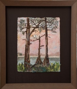 The inspiration for this mixed media piece was a picture provided by Laura Smith for her class at the 2017 EGA National Seminar. However, her picture of a mountain scene did not inspire me; a picture of a cypress swamp provided by a friend did. Never having done this type of embroidery, I felt uncomfortable. Using techniques that Laura taught, I interpreted that picture. With Laura’s encouragement, I was able to unleash my creativity and utilize several mixed media techniques. Acrylic wash on a Lutradur® provided the ground which was enhanced with fabric collage, and surface and free motion embroidery. When I share my creation, people in the Leon County (FL) area know the exactly where this is.