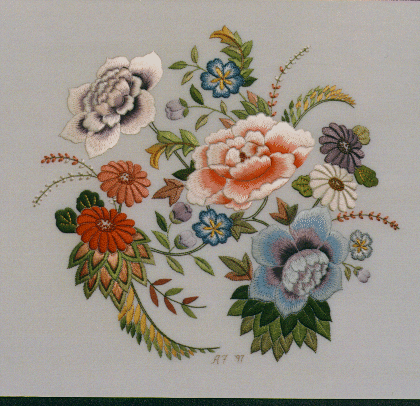 Audrey pursued her crewel embroidery education at the Wallingford Crewel Studio in Wallingford, Pennsylvania. She also studied silk and metal embroidery with Minna Sturcke and Elsa Cose. Her Japanese embroidery experience came from 6 years of study with Mr. & Mrs. Tamura, and Audrey continued to study at the Japanese Embroidery Center in Atlanta.
