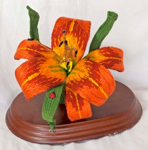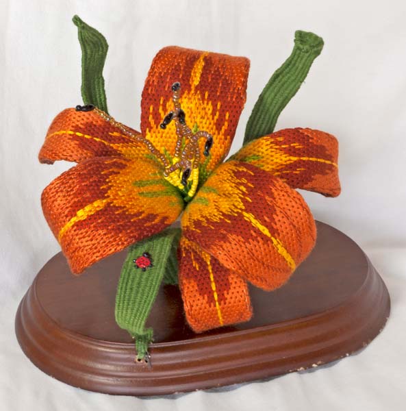 This delicate lily was created for my expertise piece for NAN teacher certification. It is stitched on white congress cloth using Au ver a soie silk threads. God picked the colors, I matched them to his lily. Wire is stitched to the back of each piece of congress cloth so that the petals can be shaped after finishing. The leaves are created by wrapping wire with stranded cotton floss. If you look on one of the leaves you will see a tiny little ladybug – she is stitched on 40 count silk gauze and then appliquéd to the leaf. Beads are added to create her feet and head.