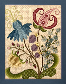 Mindy began this piece by completely working the background (14-count canvas) in two very close values of embroidery floss, white and ecru. She made a grid-like or perhaps trellis like, design for the background, which was very subtle. then she began her embroidery, using mostly Persian wool, or Medici Wool. Occasionally some fine details were done in embroidery floss. The large stylized leaves at the bottom of the design, and the demi-lune shape of the yellow flower were worked in laid fillings, couched down. Stem stitch filling is employed for the green-to-yellow leaves, with a value change for each row of stem stitch. Mindy also employed other traditional crewel stitches like chain (the stamens emerging from the blue flower, and several outlines). Bullion Knots are used for the stamens of the purple flowers, and French Knots for the centers of the small blue flowers, which are worked in needleweaving. Other stitches include Lazy Daisy, Ribbed Spider, and Satin.