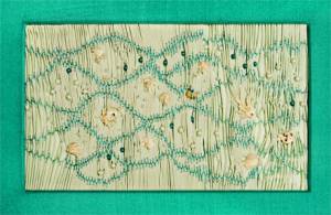 The actual stitched piece is 4-3/4″ x 7-3/4″, but matted and framed is 10″ x 13″. The inspiration for the piece was tiny shells that I collected on a family vacation in Hilton Head, SC. For the piece I pleated two layers of silk together. The top layer of silk is heavier, duller, and a lighter value of turquoise while the bottom layer is a lighter weight, shinier silk and a darker value of turquoise. The cretan stitch was used to manipulate the pleats and to create the effect of waves. Shells were incorporated in the waves with free needleweaving. Pearlized seed beads sewn in the piece look like tiny bubbles (in the water). In addition, an awl was used to create holes and bring through larger beads covered with the bottom, darker layer of silk fabric. These were to represent yet other types of ‘bubbles’ on the ocean’s surface. Silk threads were used for the stitching.