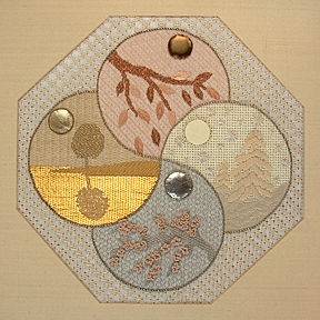 Other threads used were Medici wool, Soie d’Alger (French) silk, Marlitt, Japanese gold, and Ultra Suede. I also appliqued the “suns” from four different colors of metallic kidskin, and surrounded each “sun” with metal purls and beads. Before doing “Seasons in the Sun” I had been exploring other threads and liked the finer effects possible. But my earlier multi-thread compositions had all been samplers; this was my first true design in multi threads.