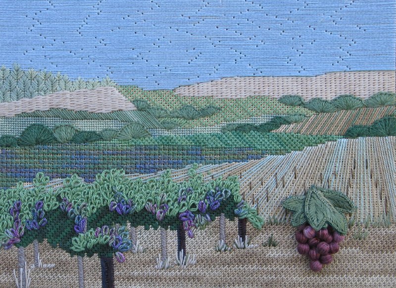 Hillside Vineyard interprets this lovely scene in canvas embroidery. I wanted to explore the illusion of movement and perspective through thread and stitch placement. The special challenge of this piece is differentiating the many hues and values of green by thread texture and stitch selection.