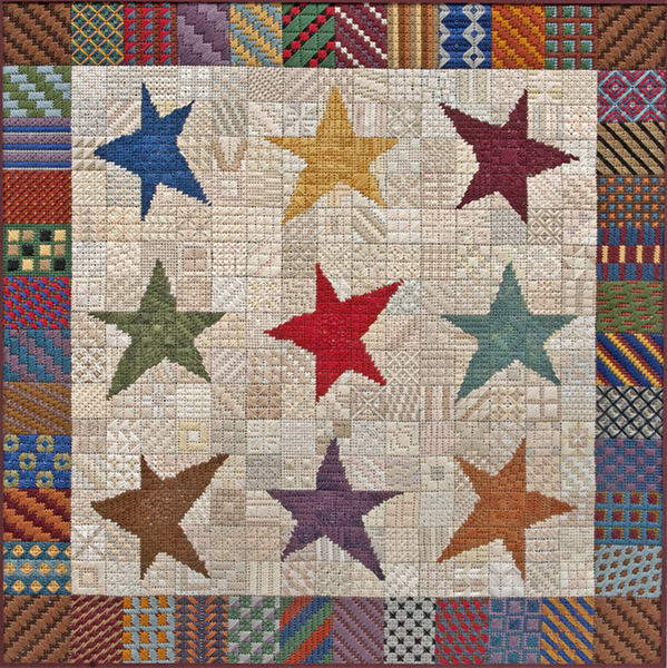 This was a pattern sold commercially, designed by Kathy Rees. It is very challenging because each of the one-inch squares in the center area is a different pattern and uses between two and four different colors of either Anchor or DMC floss.
