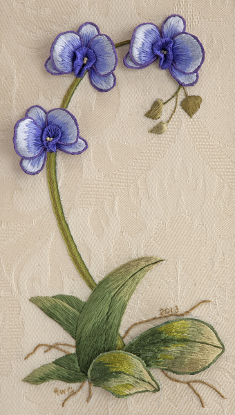This piece is from Luan Callery. I was particularly attracted by the beautiful curve of the orchid stem. I used woven cotton upholstery fabric as the background. Instead of using ribbon as the orchid petals as called for in the instructions, I decided to stitch them in long-and-short stitch stumpwork. This allowed me to pick exactly the color and the shading that I wanted. For the orchid buds I used the Japanese embroidery technique of “Blister Effect” instead of using felt padding. The detached leaf was done using wire that came from a lamp cord bundle, as I find these individual wires are just the right weight and flexibility to use in stumpwork. I added an extra detached leaf at the base to make it less top heavy.