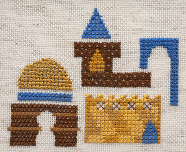 This piece is based on a tile purchased at Karakashian Brothers Jerusalem Pottery. I wondered if the rounded and pointed shapes could be reproduced by using what seemed to be variations on cross stitch occurring on some English charts. They appear to move stitches over by one thread on adjoining rows and to use stitches over two threads in one direction and only one thread in the other.
