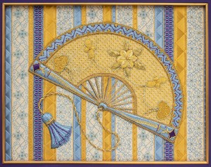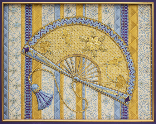The swish of a satin gown and the glow of times past are remembered in this gold and blue fan, or as the French would say élégant éventail. The foundation for creation is #24 Congress Cloth and the silk fibers used are flat silks, Zwicky twisted silk, and silk sewing thread. These combine with smooth, rough, and check purls; Faconnee; Jacerons and braids. The stitches included are vertical, horizontal, voided, and diagonal satin used flat and over padding.