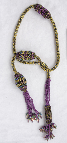 Each beaded bead is begun by creating a peyote tube of size 10 cylinder beads. They are then embellished with layers of netting using a variety of seed beads and shaped beads (tiles, daggers and magatamas). More layers are added to successive beads until the barrel-shaped largest bead is obtained.