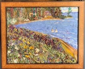 I needlefelted the lake and the woods behind it. I stitched the cottage and surrounding trees.
