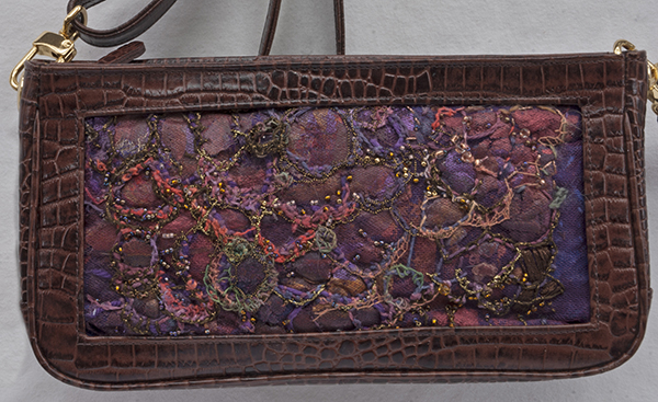 The emphasis on the class was layering. The cloth is originally painted and stenciled. It was then stitched to provide texture. That stitching was then covered with painted wonder under and foiled. Parts of the fabric were covered with chiffon.