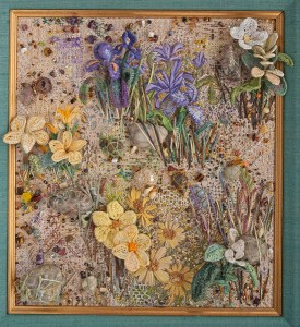 The fibers in the piece range from cotton to silk. The grass is silk raffia. There are real Petoskey stones collected from my beach as well as various beads.