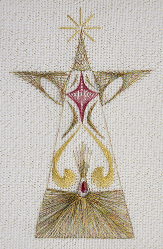 When I heard the NAN challenge was an angel, I thought “Oh, no. I don’t like angels.” Then, as I flipped through Carole Lake’s Twisted Stitches, I thought, I wonder if I could do an angel with all twisted stitches. Twisted Angel is definitely a twist on the normal angel. She is composed of “Twisty Stitches” including Jessicas, Crescents, Amadeus, Chilly Hollow, and Sprats Head, using beautiful metallic threads and a teardrop bead. The metallic thread canvas adds to the sparkle!