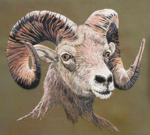 This thread painting portrait was stitched with silk thread on a silk fabric ground. My interpretation of the Big Horn Sheep was inspired by my love of animals and was adapted from a photograph by Stephen Oachs.