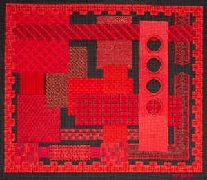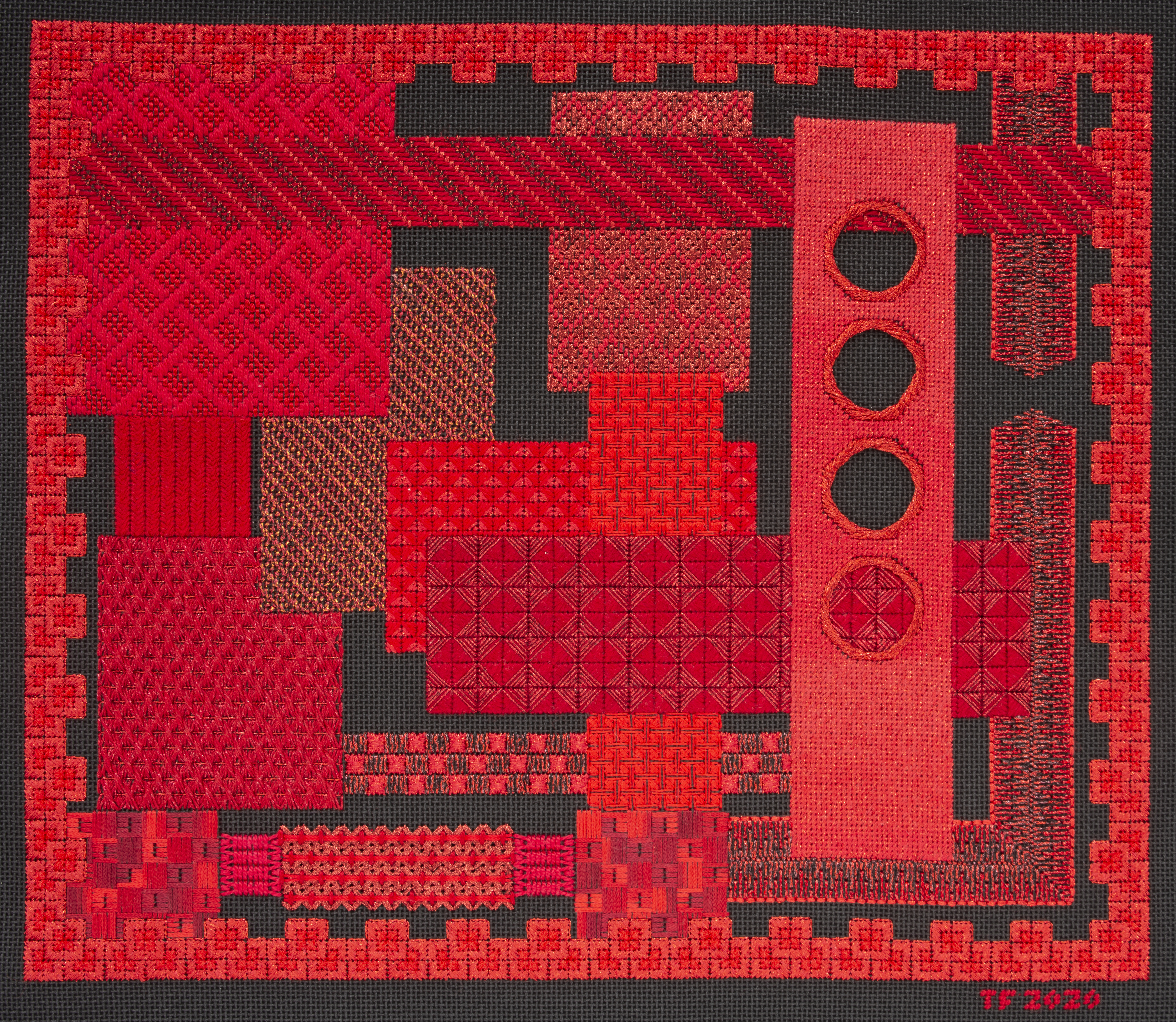 This design was printed in NeedlePointers magazine, March through November, 2017. It was designed by Jeff Kulik. I decided to stitch this piece in red threads using Silk Lame’ braid, Kreinik metallic, ThreadworX overdyed floss and metallic braid, Vineyard Silk Shimmer, Fyre Werks, Neon Rays, Marlitt, DMC #5 Pearl cotton, and Pepper Pot silk to name a few. There was no master graph to followonly an element map and a border plan plus the directions that were given. I stitched it according to the instructions but changed two elements in size to make a spatial void similar to the other blank canvas voids. This made the design stand out and not the blank canvas.