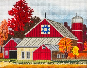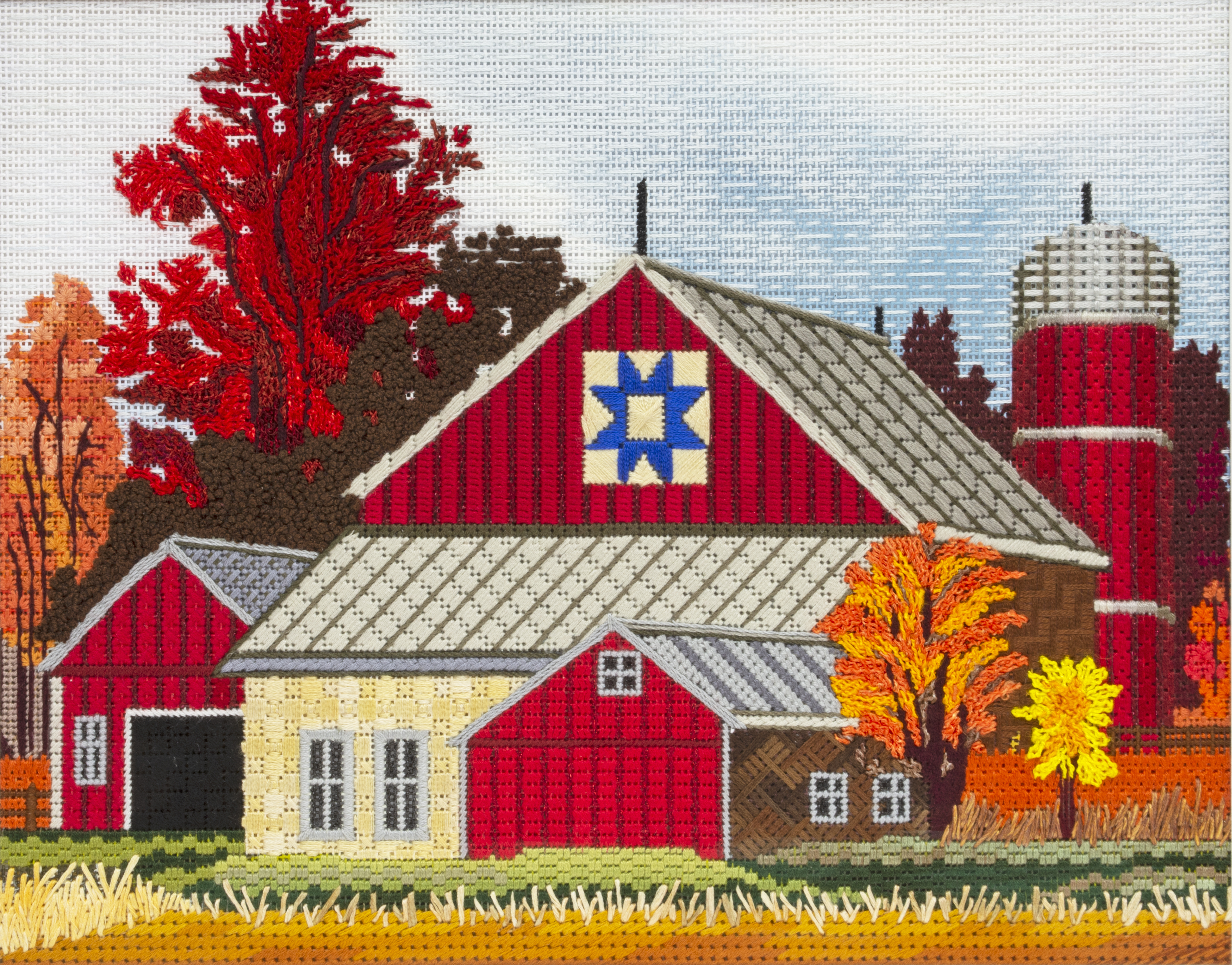 I am sentimental about farms and barns since I grew up with my mother’s family operating an apple growing business and dairy farm in New Hampshire. It is still operating today. I always love visiting the family farm. Barnyards are charming places and this piece emotes those warm feelings. The stitching went together well with Shay Pendray’s help. I enjoy doing geometric architecture and this canvas had a lot of it. The colors are bright and cheerful and most of the barns are stitched with silk in different patterns. I was especially thrilled with the silo. As I traveled I have noticed that the tops of many silos are made with gray metal that curves down and this complicated stitch was just right to make that rounded effect. The fall trees are full of various colors. I used silk on some of the trees and several shades of bouclé on the large tree. I stitched the tan grasses with Silk Straw. I envision this piece to one day be hung in the office of the family farm.