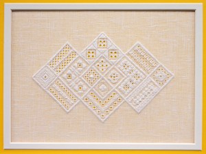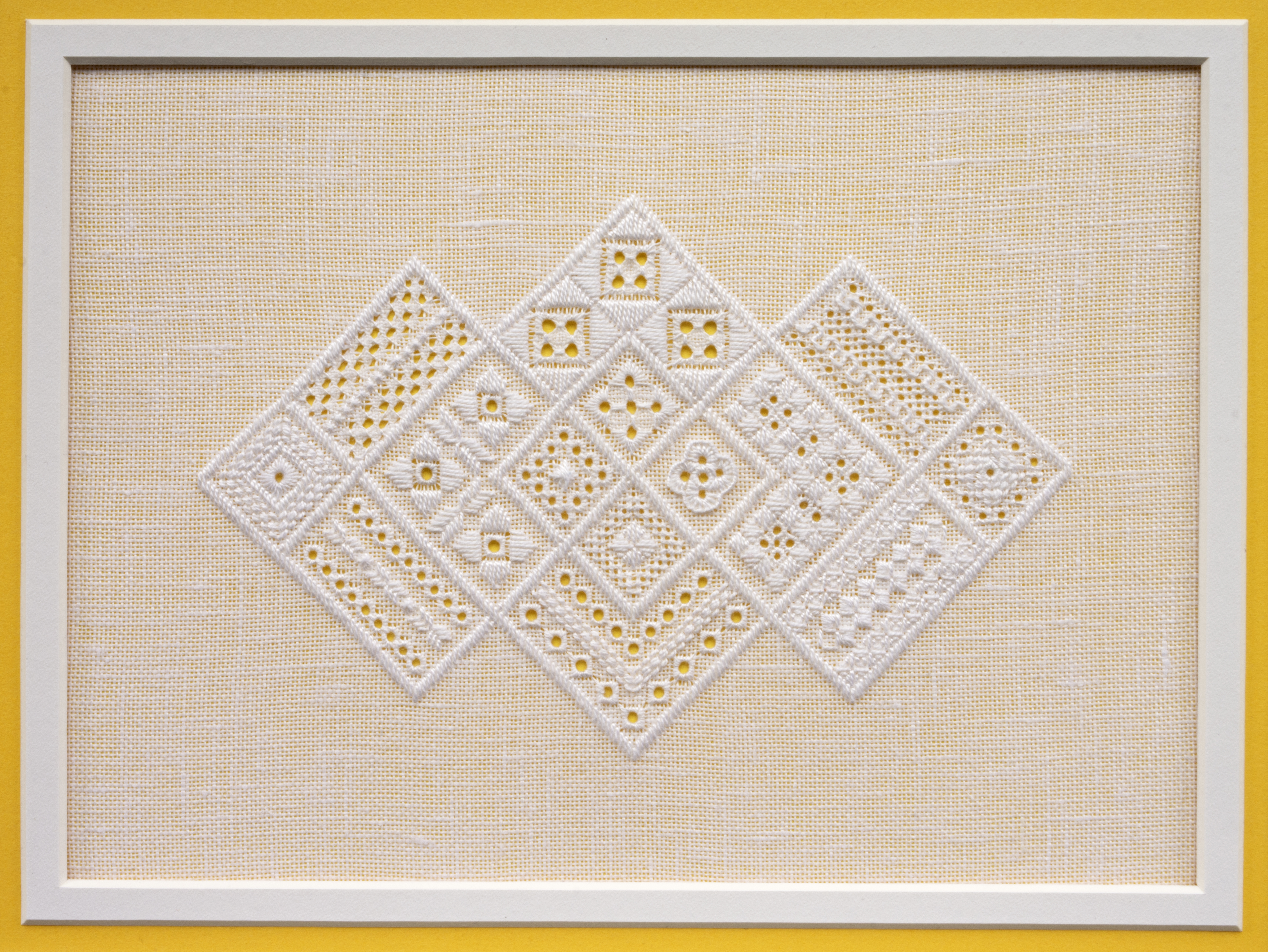 Illusion is a Ukrainian White Work piece taught at National Academy of Needlearts Assembly in 2019. While I have stitched other forms of White Work, this is my first time with Ukrainian White Work. The designer/teacher is Terri Bay.