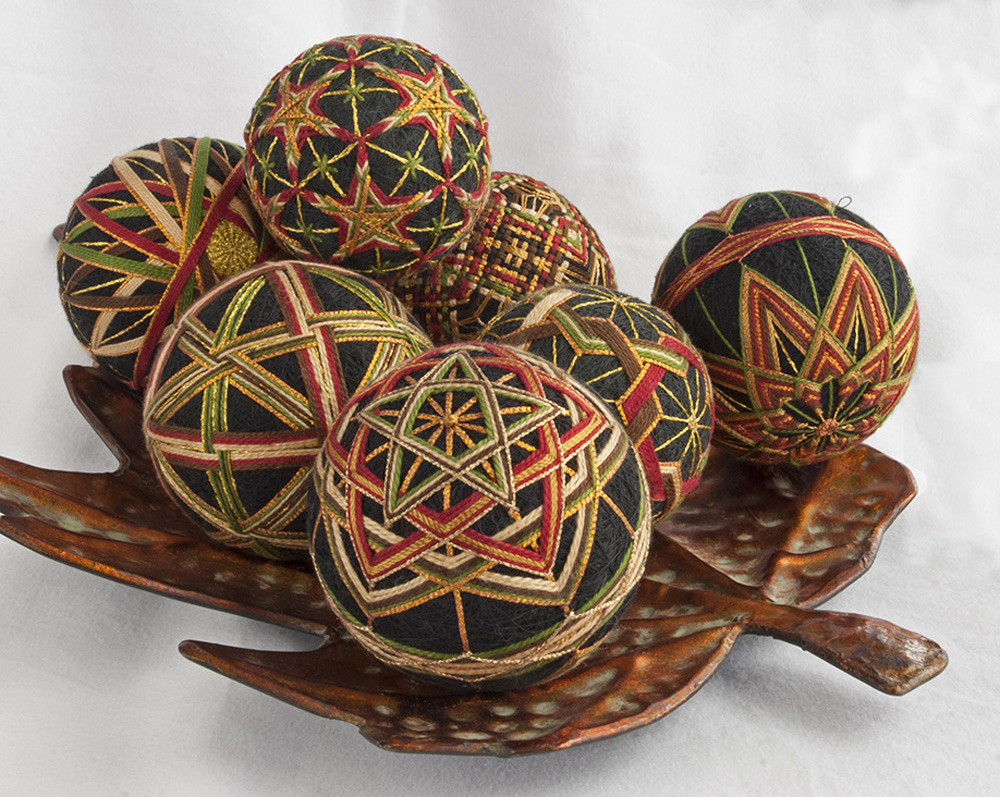 While shopping with a friend, I came upon the delightful copper maple leaf that was my inspiration for Highlights of Autumn in Temari! It didn’t take me long to go through my Temari pattern sources to come up with the display of color and texture that you see before you.