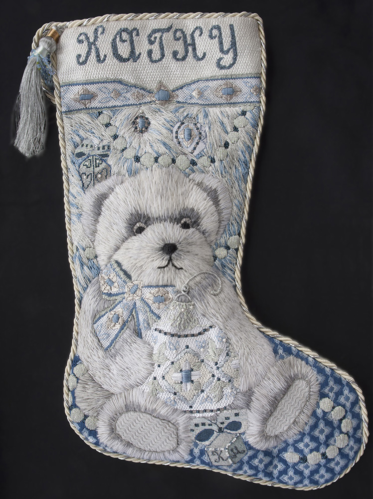 Since we have collected “Teddys” over the years, it was natural to choose the “companion” “Ice Teddy Bear”. Although I am not a “blue person”, I think I managed to still have the “icey” white snow feeling with this piece. It was a loving “setting” as I did all those long/short stitches again! Loved using all the beautiful blue and silver metallic fibers and my version of adding little pearls.