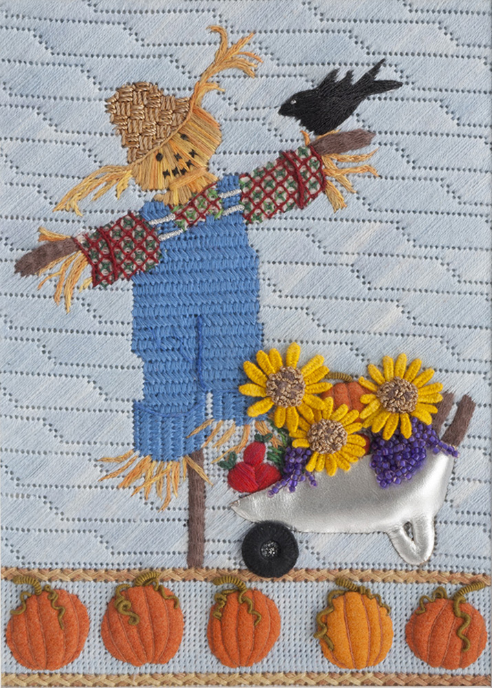 Kathy Fenchel worked with me to create a stitchguide. Scarecrow in the Autumn incorporates needlepoint stitches with surface embroidery, stumpwork, needlelace, bullion knots, French knots and beads, to create the dimensional stitched bit of Autumn that you see before you.