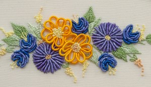 Brazilian embroidery is one of my favorite kinds of needlework, and I love stitching bullions—this piece has plenty. I love the combination of colors as well. Normally this piece is hung vertically, but my framer suggested hanging it on point, and I love how it turned out.