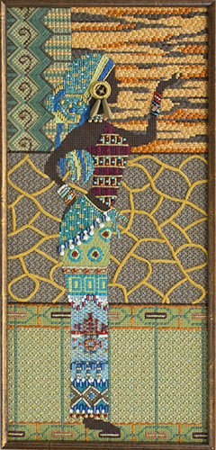 This needlepoint canvas was done with several other needlepoint colleagues working on their own similar canvas. Shay Pendray helped to plan and choose stitches and threads. We shared beads and watched as each of us chose slightly different creative ways to use the materials. I enjoyed completing this piece with this diverse variety of threads and beads. The brilliant colors were a joy to work with which contributed to the energy felt here! This lady is predominantly blue. There is a sister lady yet to come who is predominantly red.
