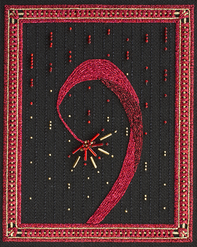 Shooting Star is a re-interpretation of an original piece entitled “Hope” that I designed, stitched and donated to a charity auction of End Domestic Abuse Wisconsin. A few years passed and I wanted to stitch the piece for myself, but not as an exact duplicate. To that end, I changed the canvas from 18-count to Congress cloth, the colors from purple/silver to red/gold, some of the stitches and added beading. I also reduced the size. I finished the piece in time for the Madison Area Chapter EGA’s 40th (Ruby) Anniversary in 2018.