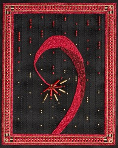 Shooting Star is stitched on 24-count black Congress cloth using Kreinik braid, ribbon Accentuate, and beads. Stitches/techniques include composite stitches for the border, upright Gobelin, backstitch, couching and beading.