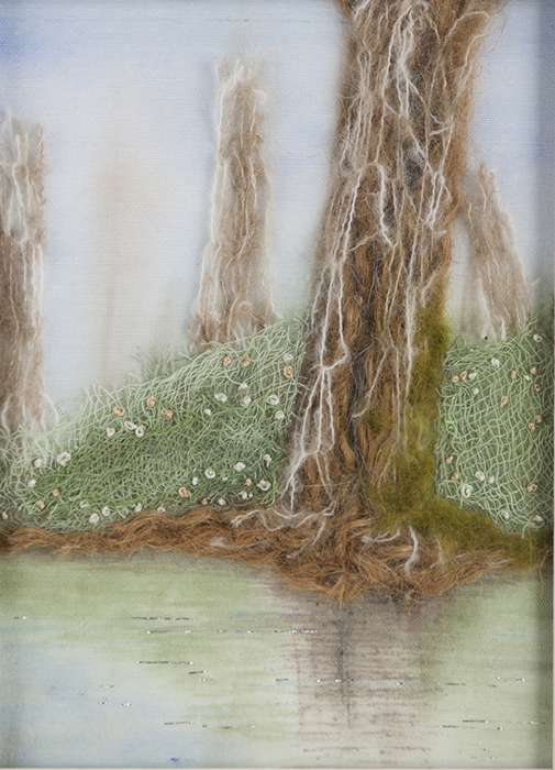 The main tree was stitched with a base of unraveled jute rope, dark wool, and wool netting. The roots are mainly jute. Green roving was felted into the trunk to represent moss. The background trees are wool netting deconstructed from a wool scarf. The low hills are painted cheese cloth on top of the painted ground.