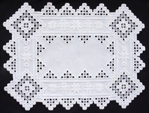 This Hardanger design is adapted from a tray cloth called Fiona from Hardanger Design by Thuve-Stua. It was stitched and submitted for the EGA Counted Thread Master Craftsman Step 5 Hardanger. I used the basic kloster setup but changed the satin stitch motifs and the filling stitches to satisfy Master Craftsman requirements.