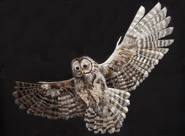 I liked the dramatic action of the Owl as he comes into land or catch his prey. I attempted to reproduce this drama with needle and thread.