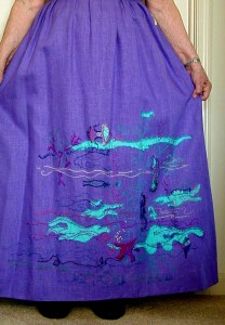 My swishy skirt was such a fun piece for me to play with. I had no deadline, no real purpose, no upcoming event to meet, just something that I wanted to try. I had this lovely large piece of lavender linen, and with my growing fascination with collage, I decided to experiment. First, I stitched the skirt, and then played with a lot of other fabrics and things, remembering that it be worn obviously, and cleaned, so would need those considerations as I worked. Gradually, the undersea theme happened.