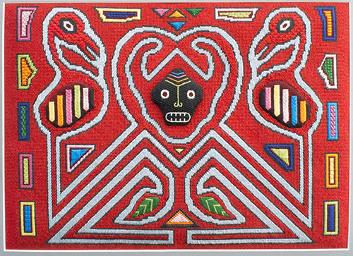 This piece is my interpretation of a Panamanian mola design using the techniques of canvas embroidery. Women create a mola design by using reverse applique, applique, and inserted applique, and include symbols and figures that are significant in their culture. By doing canvas applique in this design I honor the original technique and make it applicable to canvas work. I wanted the feather sections of the birds to stand out so chose them for applique. I used small motif canvas stitches to fill in the “slits” and used some woven stitches to fill triangles and create feathers. The cool palette represents that of traditional Panamanian molas, which includes red, black and orange. The basic color scheme, of light blue and red-orange is close to complementary. I have included other accent colors that are the same as those used in other Central American textiles.