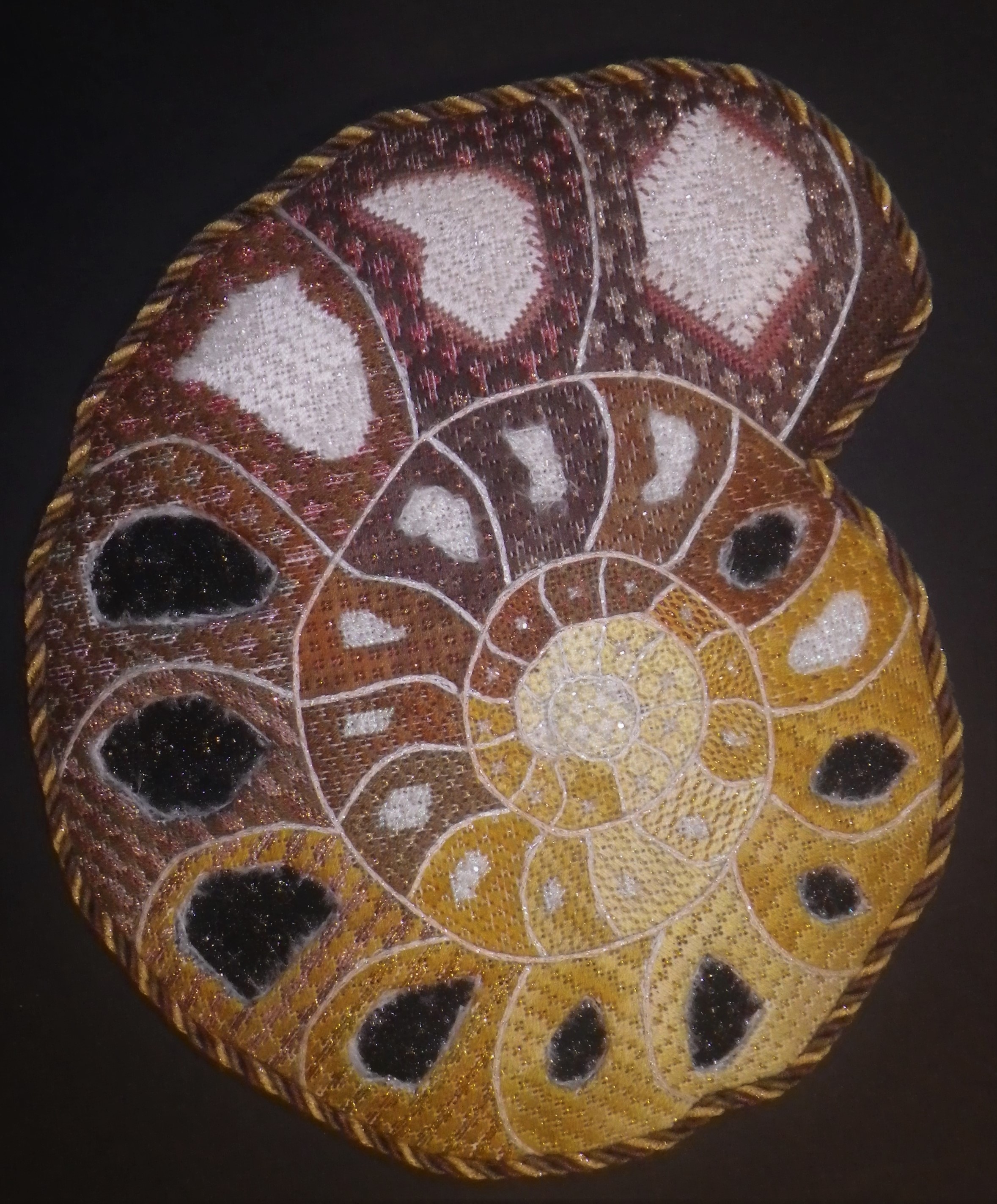 My husband is into rocks, fossils, etc. Seeing a photo of an ammonite, I decided to stitch it for him. I enlarged the photo, then drew the outline on canvas. This I presented to Debbie Stiehler to recommend threads and stitches for her class, Interpreting the Painted Canvas at NAN in 2019. Debbie was unfamiliar with this type of fossil, so researched it. We used reverse applique for the “hollow” crystal-lined chambers, a new procedure for me. So, we both learned something new! I finished it as a large ornament and it now sits in an easel.