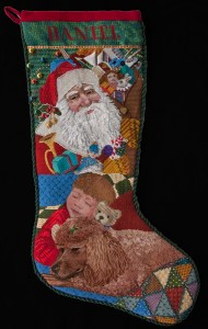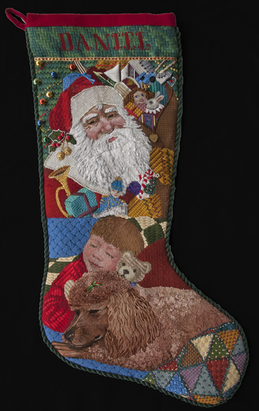 I have three grandchildren and have stitched three stockings, each with a depiction of their faces. I especially liked a picture taken of Daniel and had my friend Liz paint it on the stocking along with my dog Coco. They were great pals but sadly Coco left us and now we all are great pals with Daisy Dog. From there it was just a labor of love to plan the stitches, shade the face and enjoy making this stocking for my beloved Daniel.