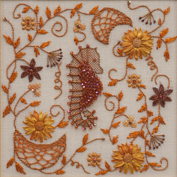 This is a Gail Sirna design. However, when I looked up real seahorses on line, I saw orange ones. I like the color orange. I started looking for beads, silk ribbon, silk thread, and specialty threads in orange to substitute. The search was inspiring and fun.