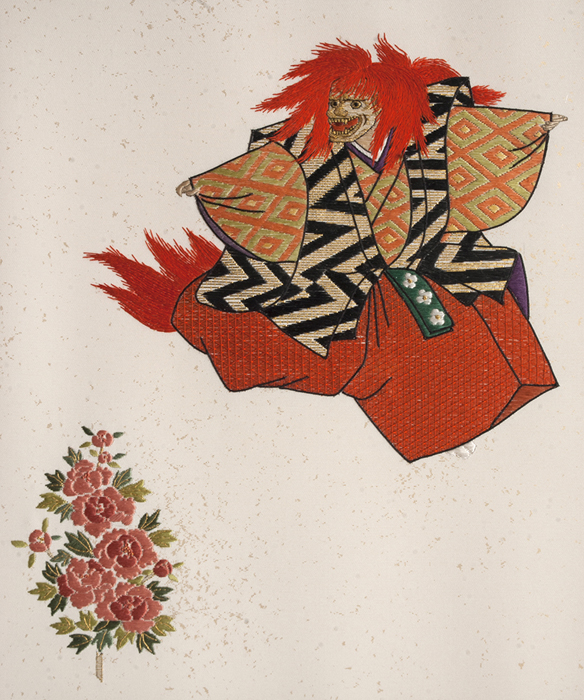 During the last 1000 years more than 100 kinds of Shishimai has been carried out in Japan. The play, when the wooden mask is worn, is called Shishimai (Lion Head). The Lion Dancer is used when people pray for a good harvest, to purify their spirit, and to drive out evil spirits. There are many variations of the mask, but this is an embroidery of the Gold Shishi (mask).