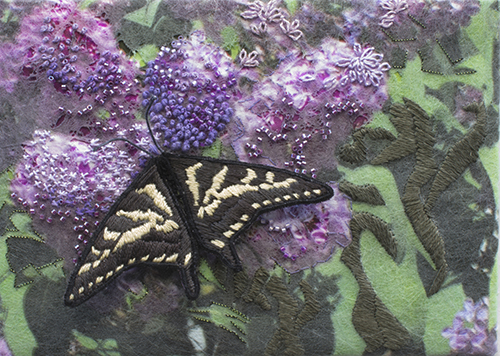 This butterfly is getting just a tipple of nectar from luscious lavender lilac flowers as it flutters busily from one to another. My original photograph is printed twice – first on a lower layer of cotton fabric, then an upper layer of Lutrador – a Pellon material. In the area of the flowers the Lutrador has been randomly melted away to suggest a sense of depth. The foreground flowers and leaves are stitched and beaded for interest, with the attached butterfly adding dimension. The outline of the raised butterfly wings is cloth wire covered using a buttonhole stitch.