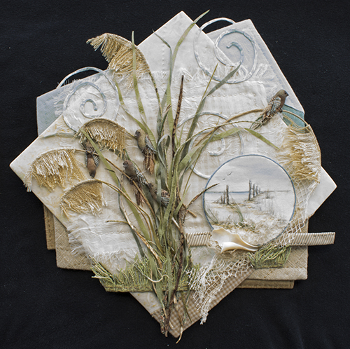 The little birds are constructed with fabric, polymer clay beaks, and tiny wrapped wire for their feet. The sea grass is made with frayed fabric on a cloth covered stem and silk/cotton fabric leaves. I thought later to include the small watercolor and embroidered seascape to inform the viewer of the location of the events in the piece.