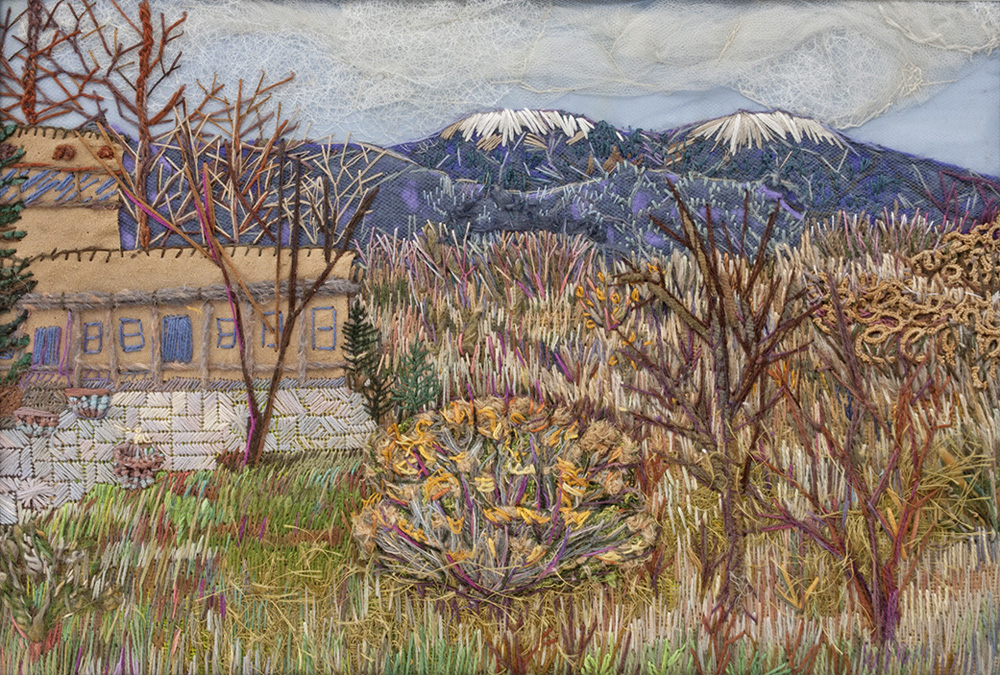 The sky is created with various laces. The mountains are handmade paper and felt needle-felted together. Tea dyed lace and tatting form much of the brush and the house is suede. Stitching ties the elements together