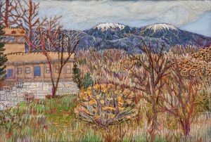This piece reflects my memories of an EGA Fiber Forum retreat with Jan Beany and Jean Littlejohn in early spring in Taos, NM. As a native of a Great Lakes state which is very green and very flat, the mountainous high desert of New Mexico presents an entirely different feeling and color palate. I am used to the blues and greens of fresh water and forests.