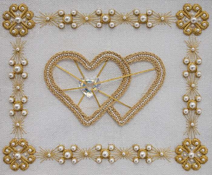 The materials used in this piece included: opal 18 ct canvas, gold braid (#8 and #12), gold ribbon (1/8th inch), pearls (8mm, 6mm, 4mm, 3mm, and 2.5mm), gold double braided back thread, spangles (#1), and one Swarovski crystal AB Heart (27 mm).